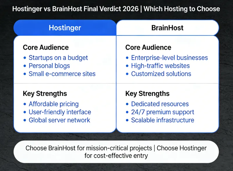 The choice between Hostinger and BrainHost depends entirely on your technical skills, budget, and website needs. Here’s a clear recommendation to help you decide: